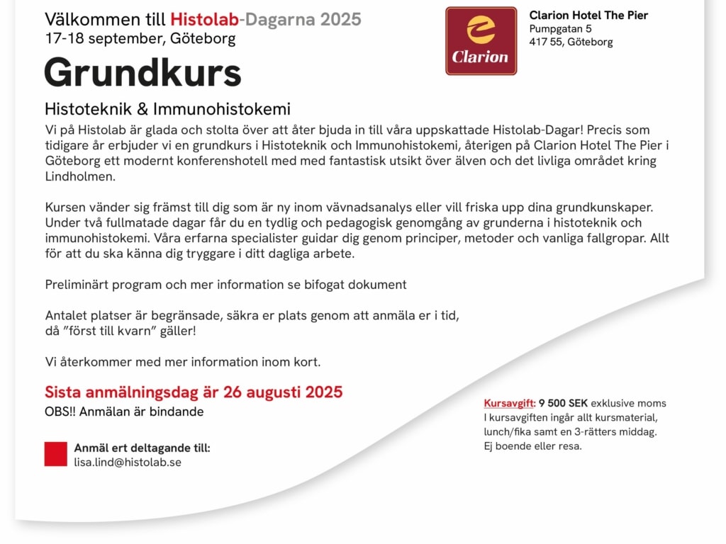Antalet platser är begränsade, säkra er plats genom att anmäla er i tid, då ”först till kvarn” gäller! Anmälan: Du anmäler dig genom att skicka ett mejl till lisa.lind@histolab.se